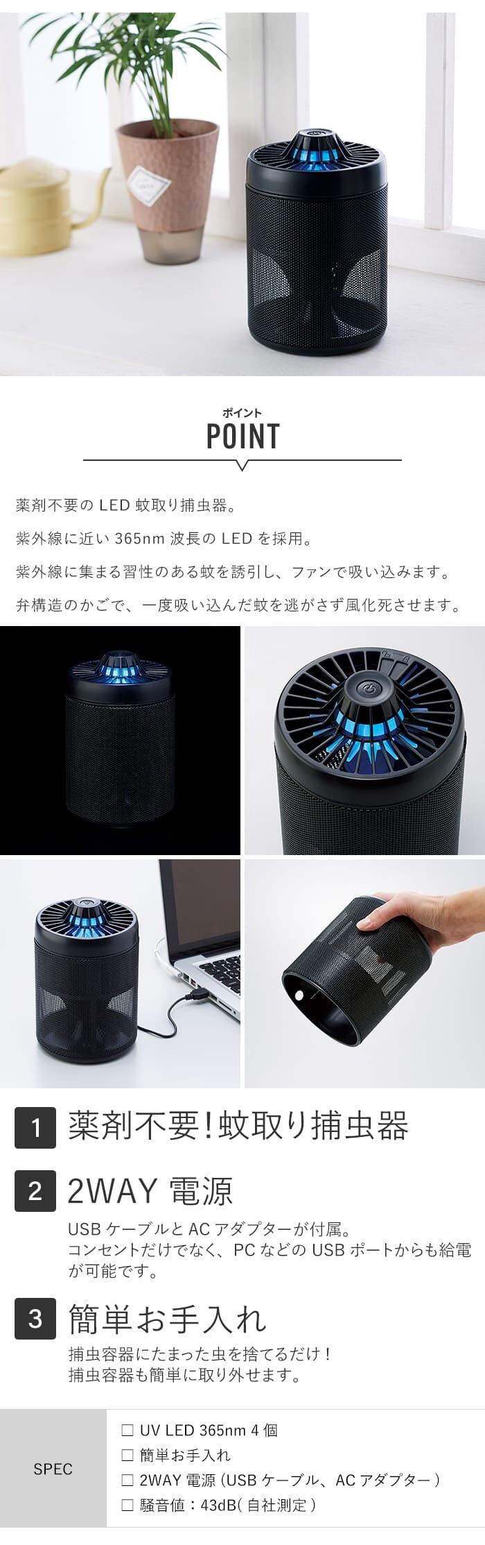 薬剤不要のLED蚊取り捕虫器