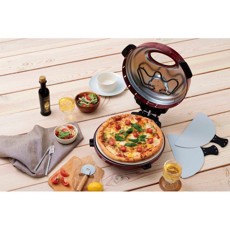 外はこんがり、中はふっくら石窯焼き本格ピザロースター 特殊なセラミックのプレートで表面はこんがり、中はふっくら美味しい本格ピザが楽しめます。ゆっくり回転しながら焼き上げるので、焼きムラも少なく焼き上げます。30分タイマー付き。小窓から焼き具合が確認できます。