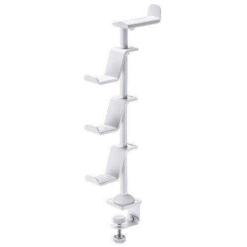 ゲームパッドを3個とヘッドフォンをかけられクランプで固定するスタンド。ホワイト。
