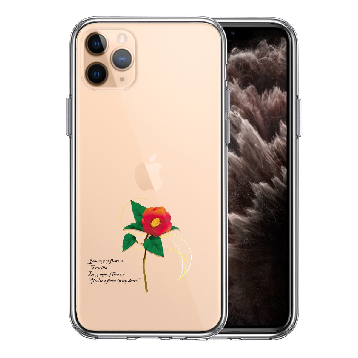 iPhone11pro 側面ソフト 背面ハード ハイブリッド クリア ケース 1月生まれ 花 一輪花 椿 花言葉 付き