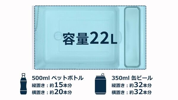 ●庫内サイズ目安:500mlペットボトル×約20本(横置き)、350ml缶×約32本