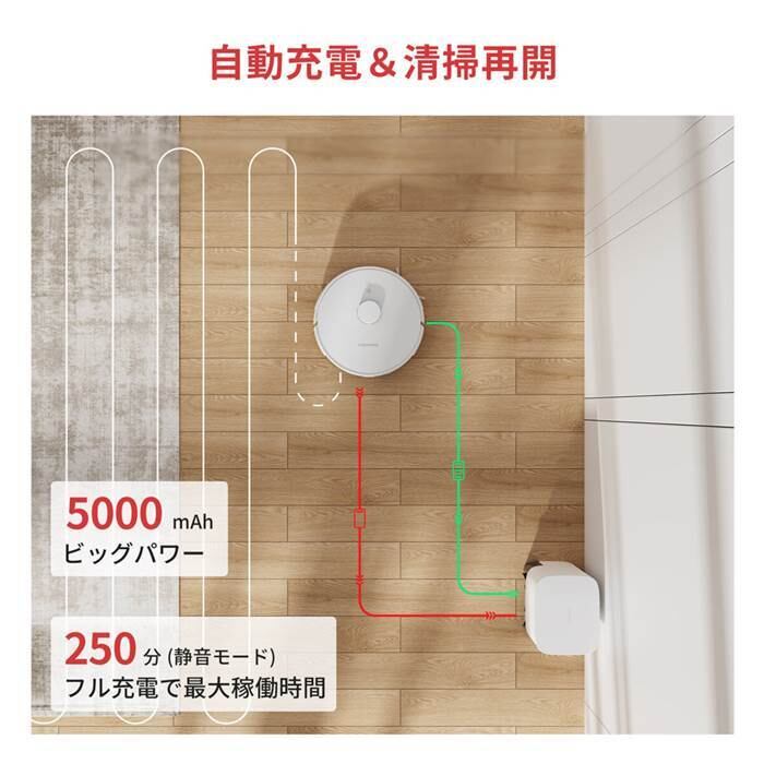 5000mAh大容量の充電式リチウムバッテリーを搭載、フル充電で最大250分運転可能で、清掃面積は約3-5LDK(155畳、静音モード)です。バッテリー残量が少なくなると自動でステーションへ戻り充電し、満充電になると最後にアーカイブした場所から清掃再開可能。